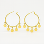 Coin hoop earrings crafted from brass with a gold tone finish feature an inner diameter of approximately 1.7 inches and are designed to be weightless for comfortable wear. These earrings make a perfect addition to any outfit with their classic yet modern appeal. They are also lightweight, ensuring you can wear them all day without any discomfort.